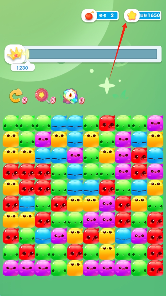 3、进入关卡2,瞄准同色星星连消,积累分数,朝着1650分目标推进新关卡,点击查看。