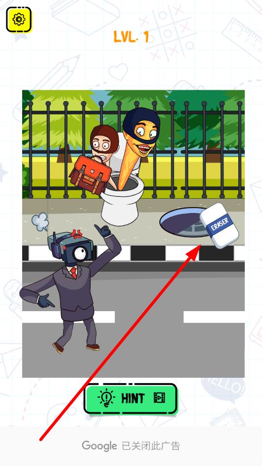 1、点击“START GAME”进入游戏,在LVL.1关卡,观察场景元素,如“ERASER”道具,尝试点击、拖动操作,触发解密互动,熟悉搞怪解密逻辑。