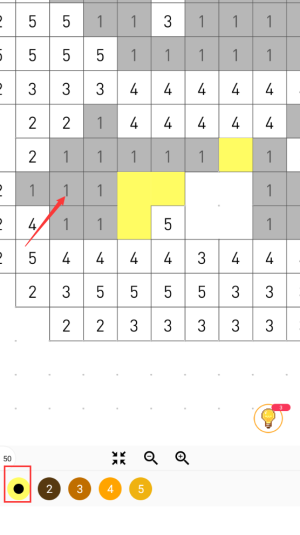 3、选择黄色颜料,填充数字1对应的灰色方格。