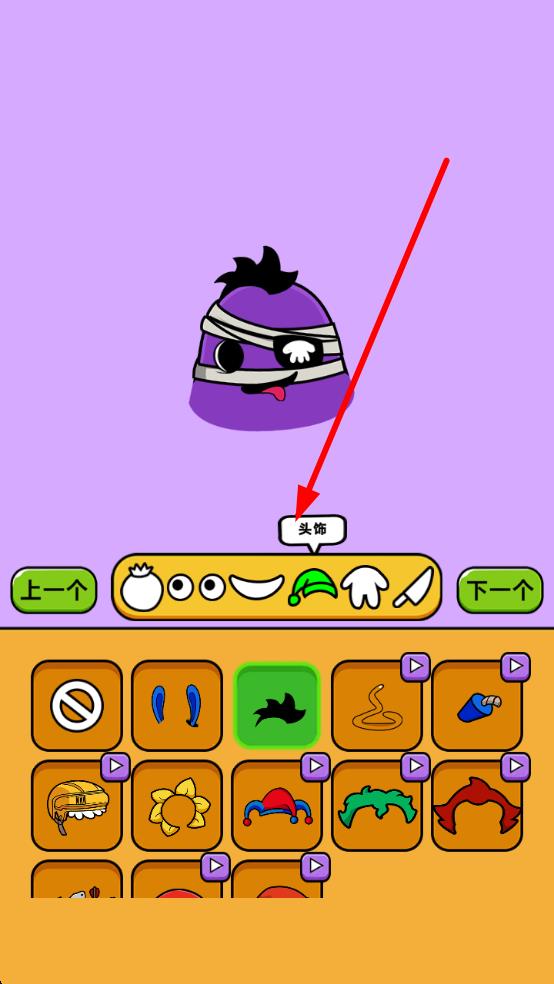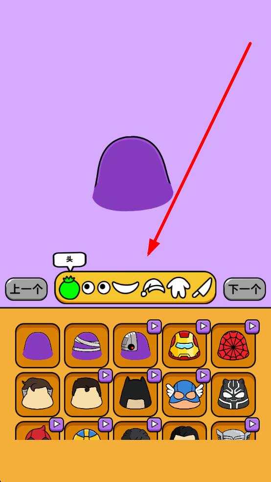 1、元素选取:进入分类界面,如“头”“头饰” ,滑动浏览元素,点击心仪部件,为造型储备素材,直接开启创作的第一步。