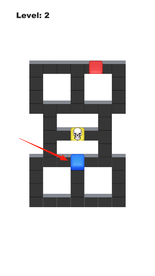 2、来到第二关迷宫,界面呈现黑色砖块构成的地图,有红色蓝色方块及中间带骷髅头的黄色区域,操控蓝色方块移动,通过上下左右滑动,让方块在通道穿行,