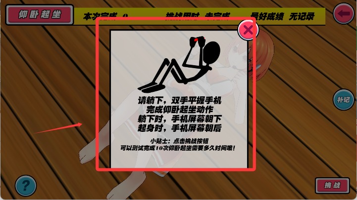 1、进入训练环节后,根据画面中的提示及倒计时指导完成指定动作,使用重力感应模拟现实肢体动作,确保动作合规即可得分。