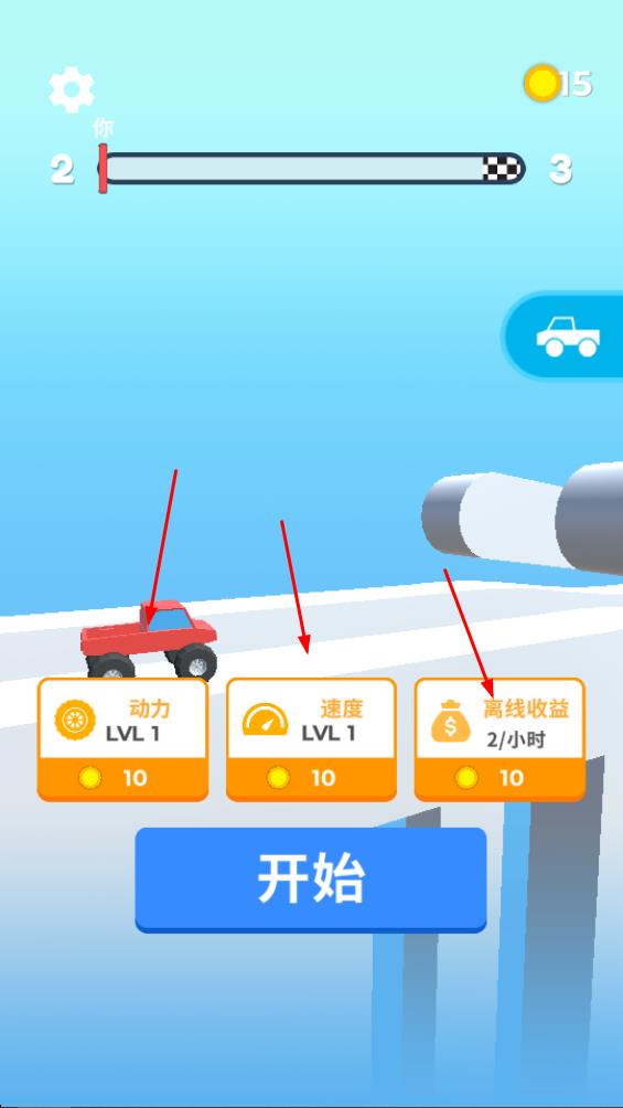 3、完成关卡后,使用积累的金币升级车辆属性动力、速度、离线收益,提升游戏体验。