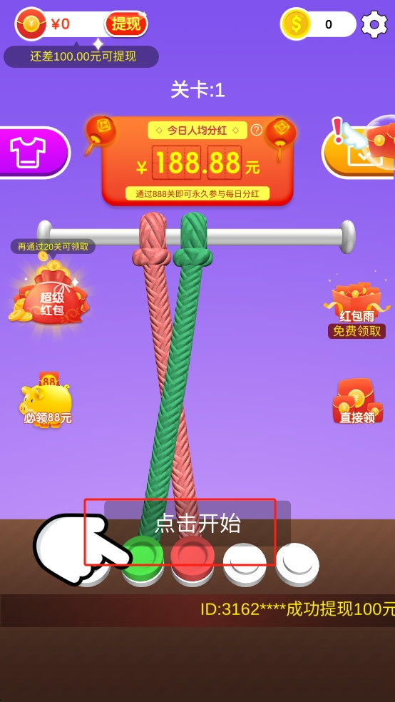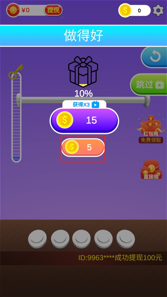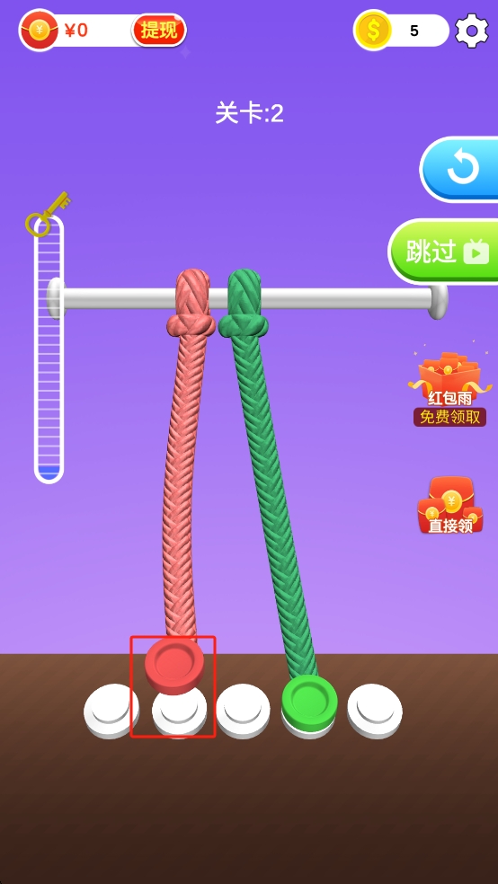 3、绳索完全解开后可以领取5金币奖励,可看广告获得3倍奖励,积累金币解锁新关卡、道具,提升解绳效率。