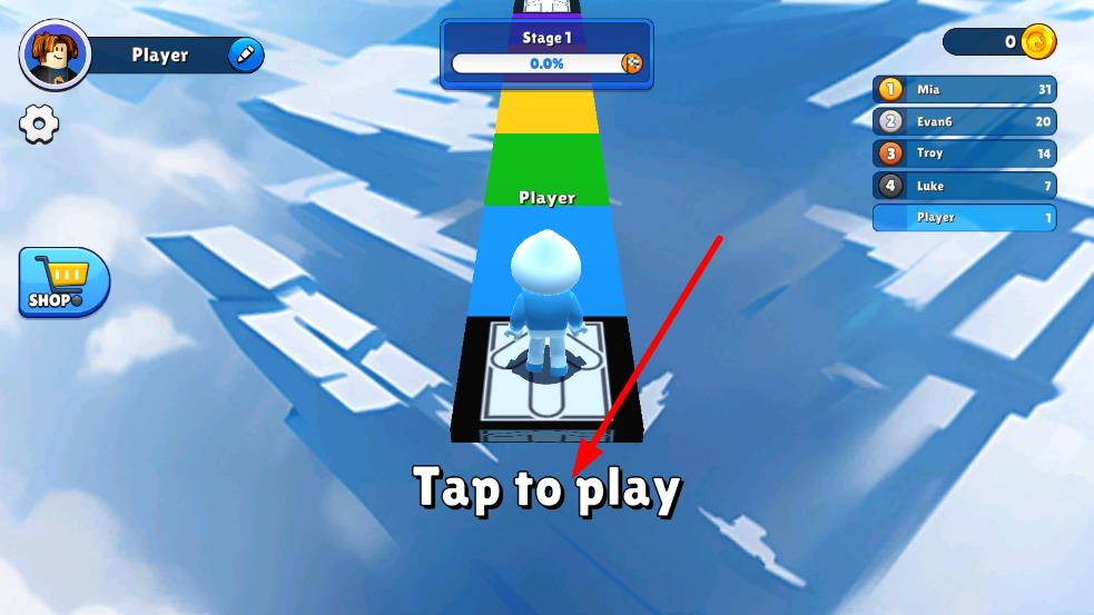 1、初始界面见“Tap to play”提示,点击屏幕操控蓝色小人开启第一阶段关卡,熟悉基础跳跃操作,开启跑酷挑战。