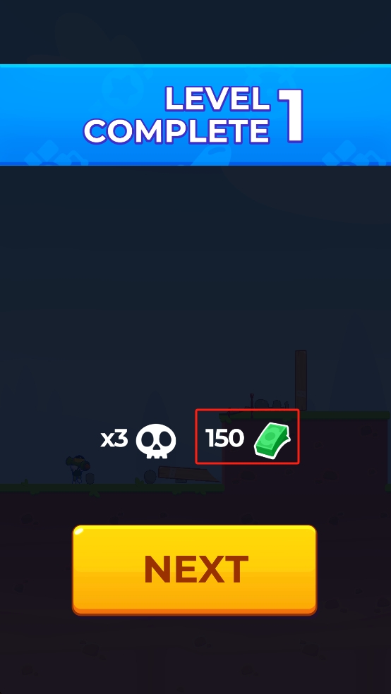 3、所有设施被摧毁后,场地烟雾散去,获得150现金奖励,点击NEXT进入下一关,积累现金用于解锁武器、升级角色,提升战力。