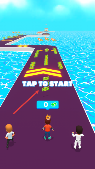 1、关卡开始,点击TAP TO START,操控角色在跑道出发,收集沿途金钱道具。