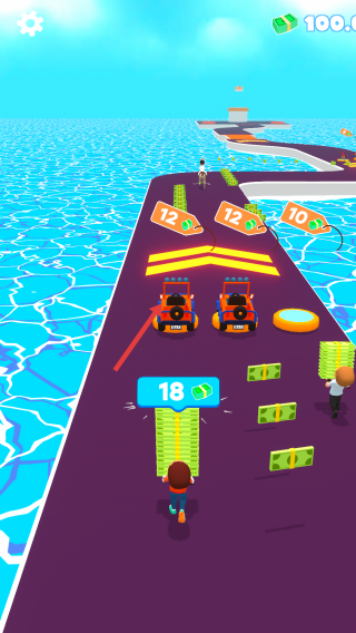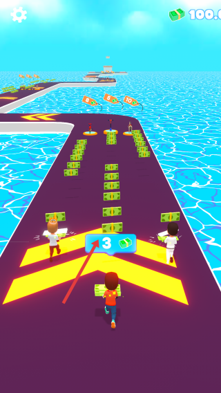 2、拾取钞票积累资源:赛道沿途散落着大量钞票,玩家需灵活调整小人位置,尽可能多地拾取钞票,游戏内钞票数量无限,拾取越多,可用于购买和升级道具的资源就越充足。