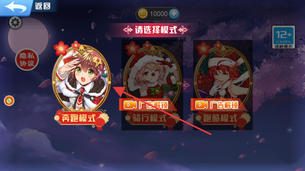 1、游戏模式选择界面,根据喜好点击奔跑模式等选项进入游戏,可留意广告解锁提示获取更多模式。