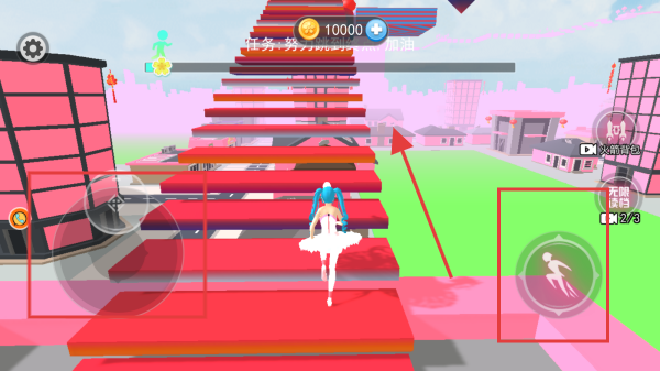 3、操控角色在场景中前进,利用左侧移动摇杆和右侧跳跃等按钮,按任务:努力向前冲要求,躲避障碍前行。