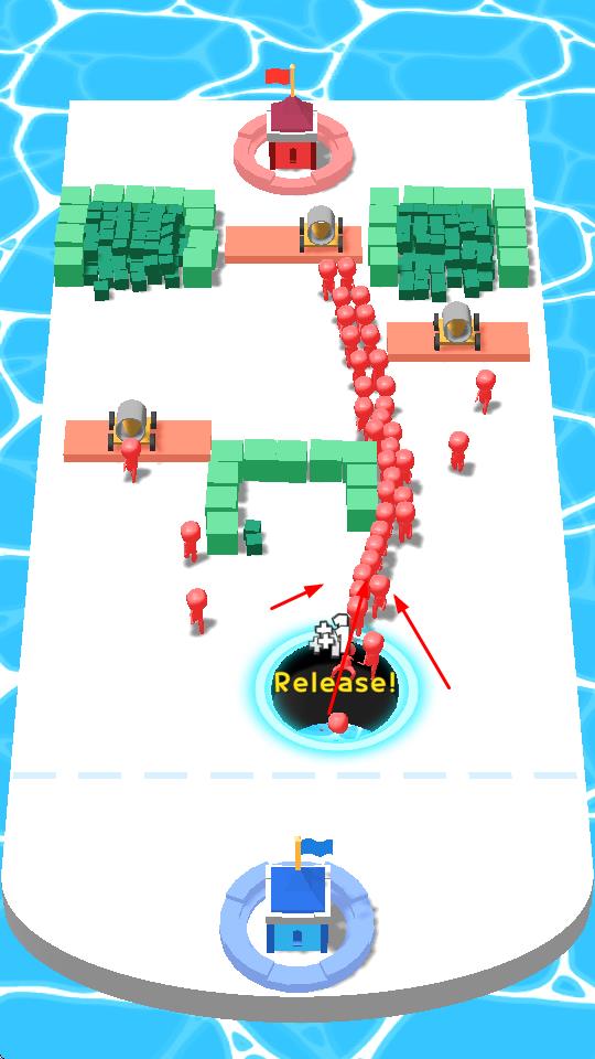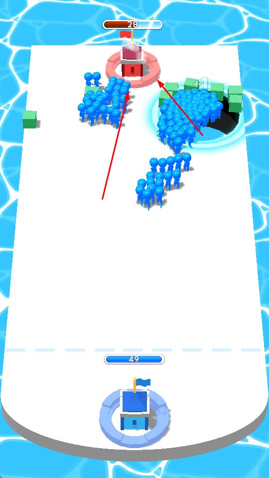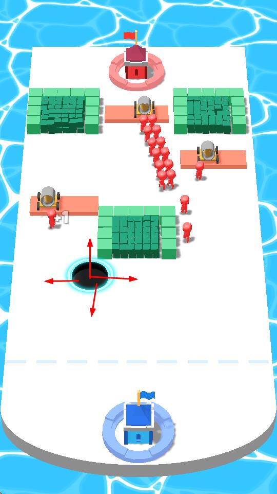 3、随着游戏推进,红色小人的数量和分布会变得更加复杂,需灵活操控洞口,持续吞噬红色小人,壮大蓝色小人队伍,最终指挥蓝色小人队伍攻击红色小人的建筑。