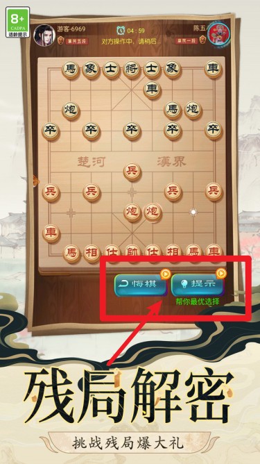 3.残局辅助系统:残局模式中可使用"悔棋"与"提示"功能,帮助玩家练习破解技巧,同时享受不断闯关的成就体验。