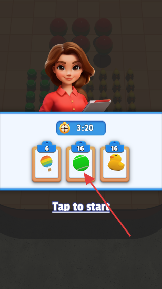 2、关卡选择界面,看到倒计时和不同物品图标,点击Tap to start及对应图标,如绿色球图标开启关卡。