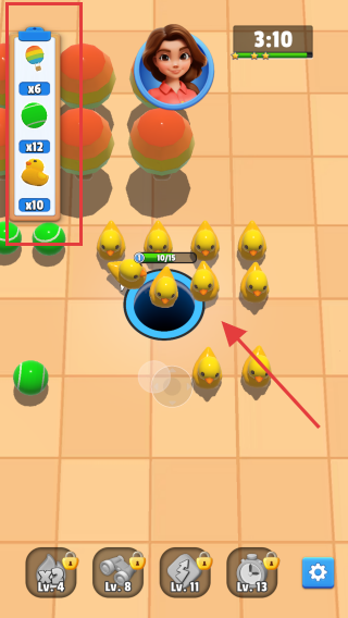 3、游戏进行中,留意屏幕上方剩余时间,按左侧清单收集对应物品,如将黄色小鸭送入黑洞完成任务。