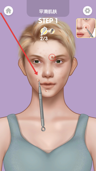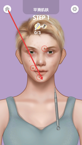 1、游戏开启平滑肌肤任务,依据红色指引,用粉刺针点击对应痘痘,完成3次清理,从0/3到3/3。