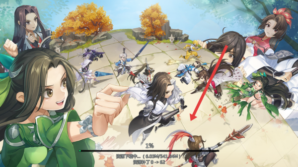 2、资源加载阶段,等待进度条推进,当前1%,共541.24M,同时浏览角色群像,记不同武侠形象与武器。