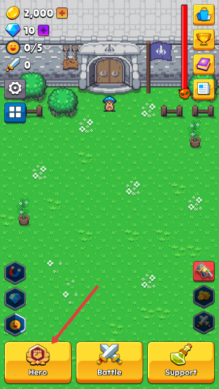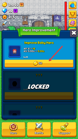 2、点击下方Hero按钮,进入英雄界面,消耗金币如50金币提升英雄属性。