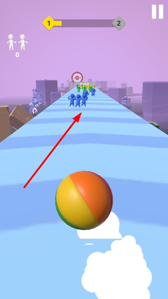1、进入后控制初始粘性球在赛道滚动,学习粘住首个小人,熟悉点击和拖动的操作方式,感受球球变大的乐趣。
