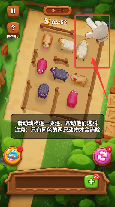 2、拖拽相同图案的小动物,当它们相邻时自动配对消失,完成消除任务。