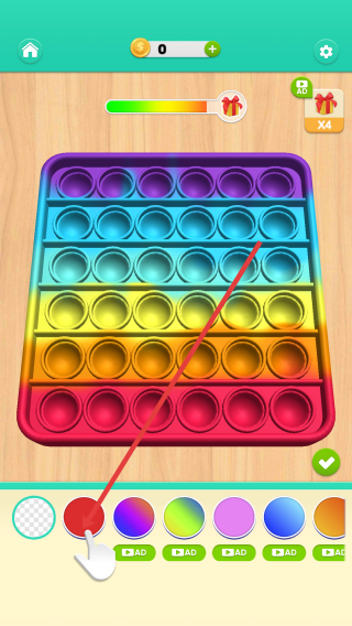 2、观察进度条,若解锁染色,点下方色彩工具如红,给指定泡泡染色换外观并解锁。