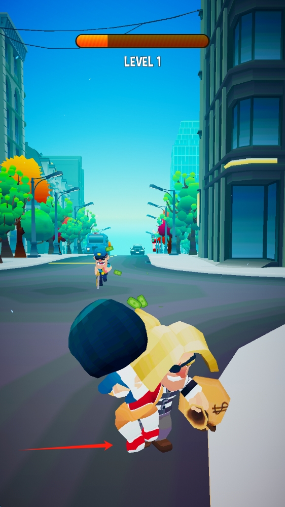 1、进入Level 1,滑动屏幕控制角色移动,躲避警察,收集路上道具,推进逃脱,滑动移动人物。