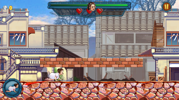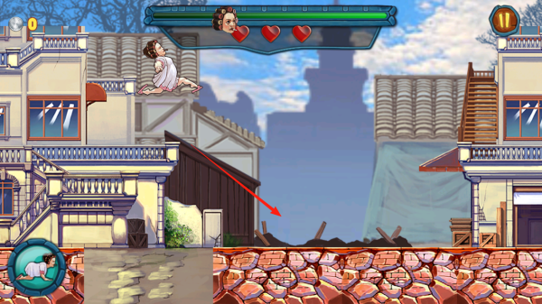 2、遇到缺口、砖墙等障碍,用跳跃越缺口,滑行穿低矮处,躲避途中爆炸物,保持生命值上方心形。