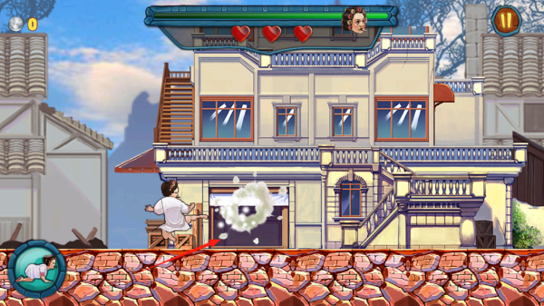 1、操控卷发、穿睡衣的家庭主妇角色,在城镇街道场景跑酷,按箭头指引前进方向,熟悉跳跃、滑行左下技能操作。