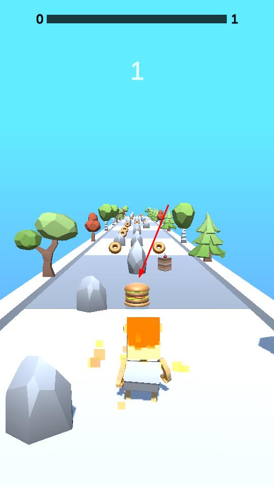 1、点击进入STAGE 0操控角色在道路跑酷,面对汉堡等道具要收集,助力游戏进程遇见石头等障碍需躲避。