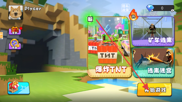 1、游戏开始界面,点击开始游戏按钮,可从爆炸TNT、矿车逃离等玩法中选择进入游戏。