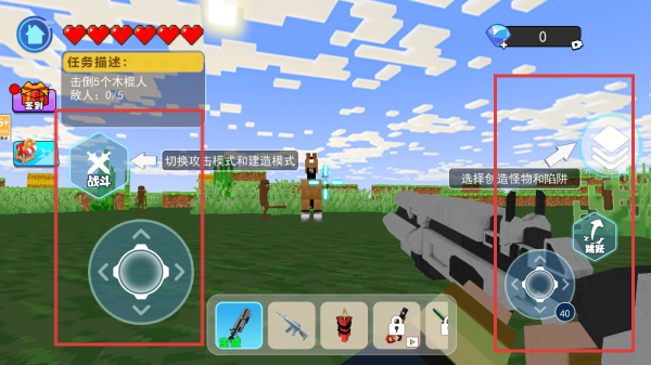 2、进入游戏场景,熟悉左下角移动摇杆和右侧操作按钮,通过切换攻击模式和建造模式适应战斗和建造操作。
