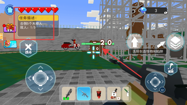 3、面对任务描述:击倒5个木偶人,利用手中武器瞄准木偶人射击,留意伤害数值,完成任务目标。
