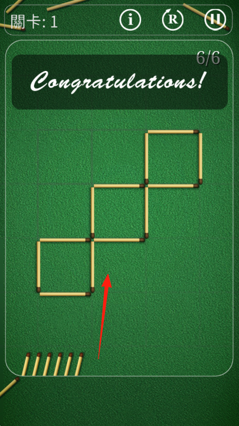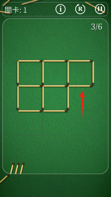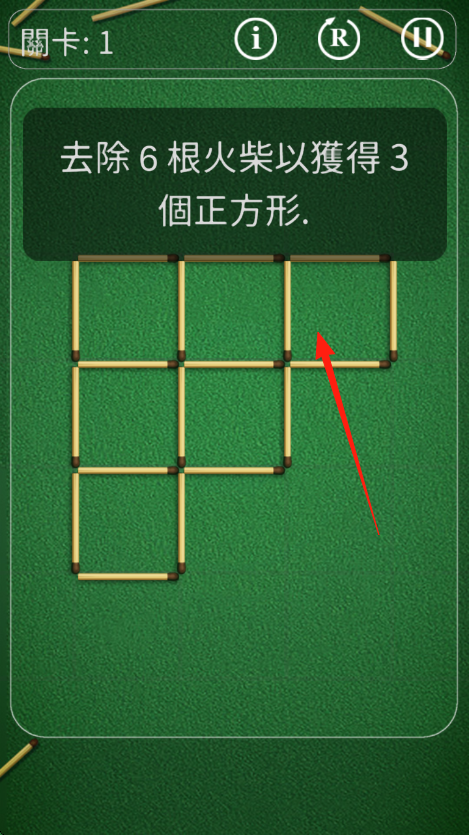 1、关卡要求去除6根火柴,获得3个正方形,观察初始布局,是由多根火柴组成的多个小正方形拼接结构。
