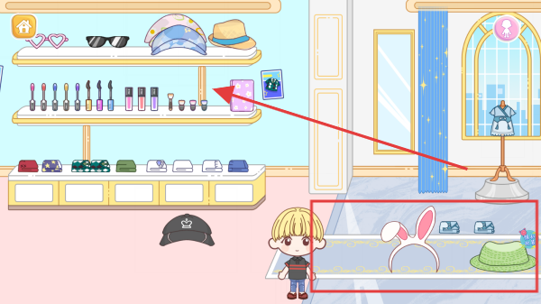 2、进入商店场景,点击货架上的帽子、眼镜等饰品,或地面上的物品,为角色选择并搭配装扮。