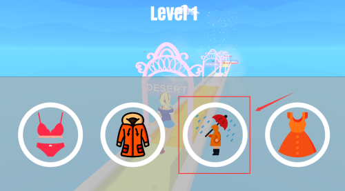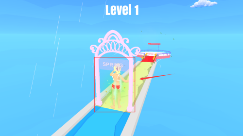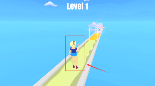 1、控制红框金发女孩,沿道路走向粉色拱门过关。