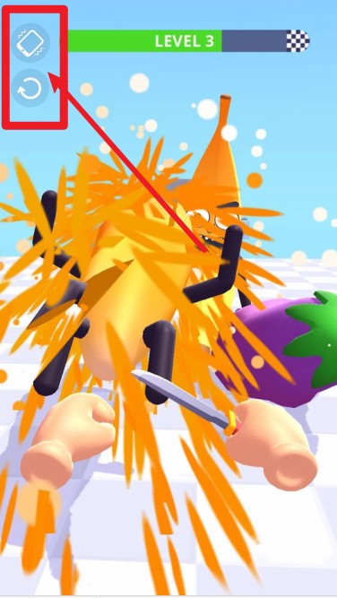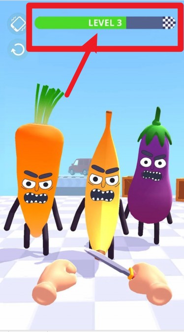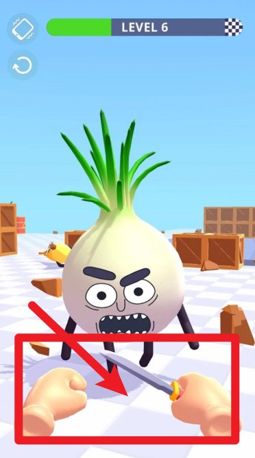 3.玩家以第一人称持刀攻击敌人,滑动屏幕控制方向,面对愤怒的蔬果时必须快速反应果断出手。