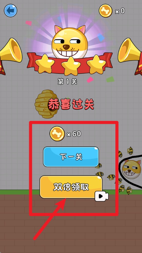 2.关卡完成后会跳出奖励界面,点击“下一关”可继续游戏,也可以选择“双倍领取”获取更多骨头奖励。