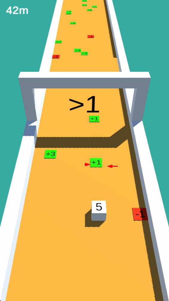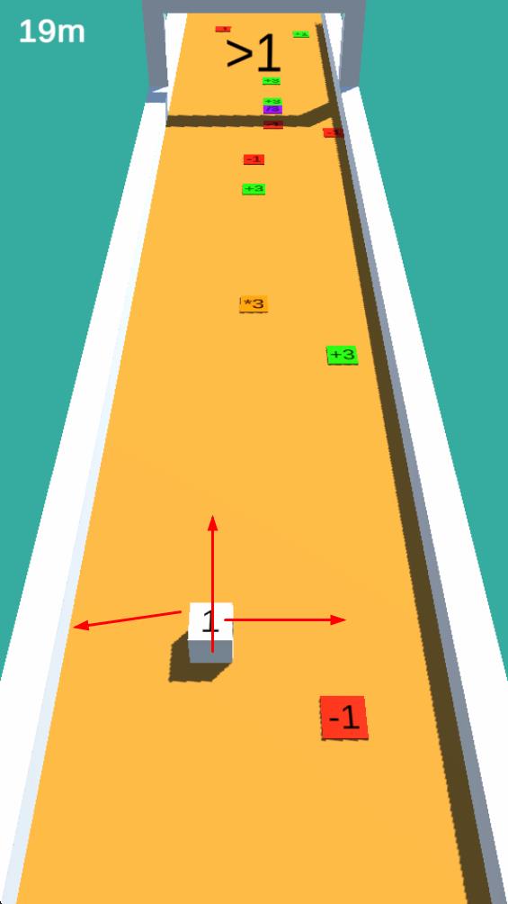 1、操控带数字的方块在跑道上左右移动,选择经过+*等标识的方块,改变自身数字。