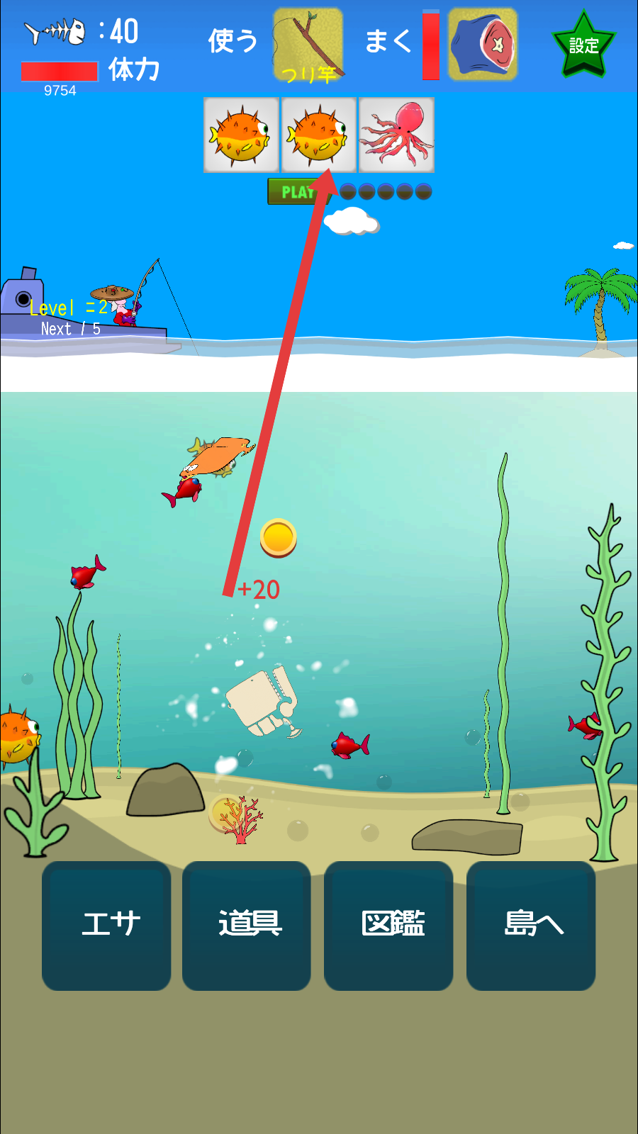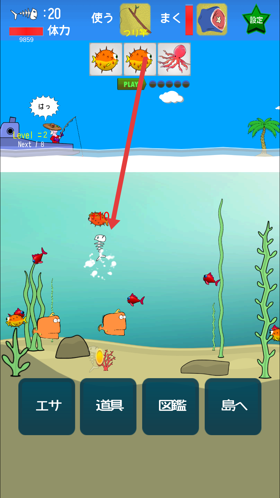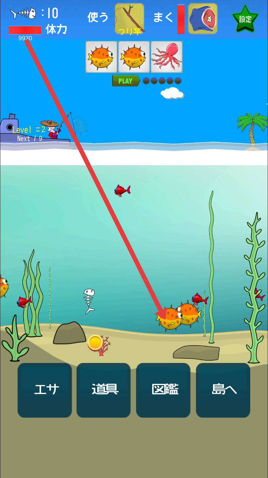 1、点击エサ选鱼饵,结合上方鱼类图鉴,选钓河豚等适配饵,点PLAY开始钓鱼。