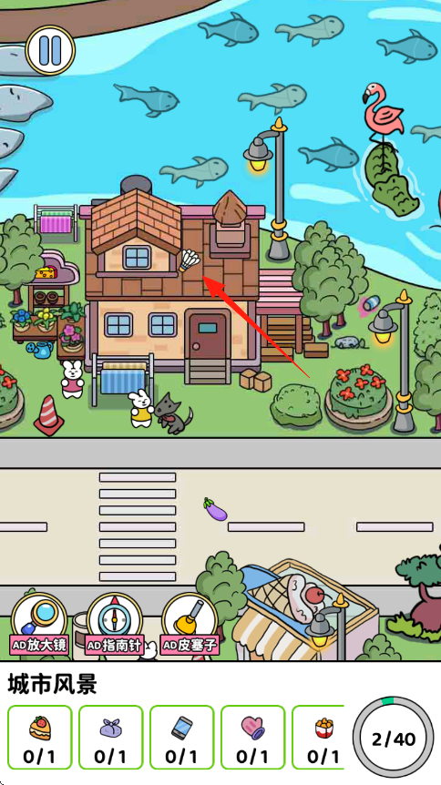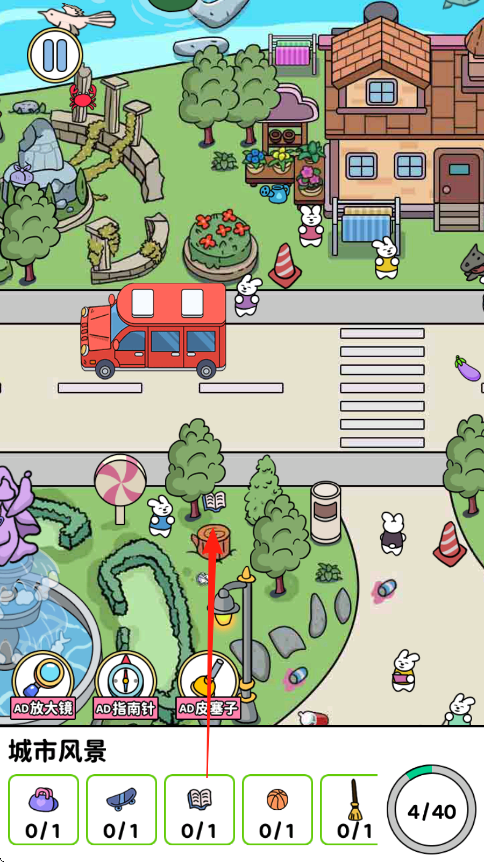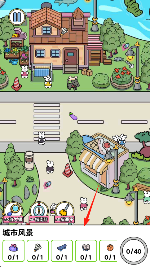 2、底部城市风景栏显示目标手提包、滑板等,在场景对应位置屋顶羽毛球、树桩书本点击,收集物品,完成进度。