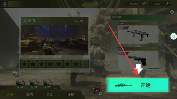 1、游戏关卡选择界面,选择关卡1,点击开始按钮,进入射击游戏环节,开启战斗挑战之旅。