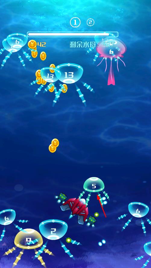 2、隐藏道具系统:特定水母被击败后会掉落稀有道具,使用后可获得临时超强火力或无敌护盾,助你突破困境。