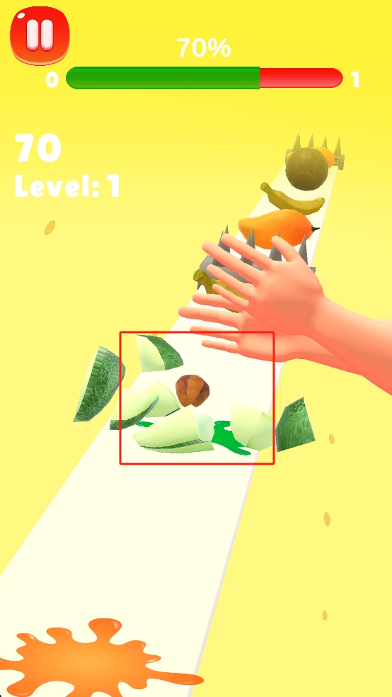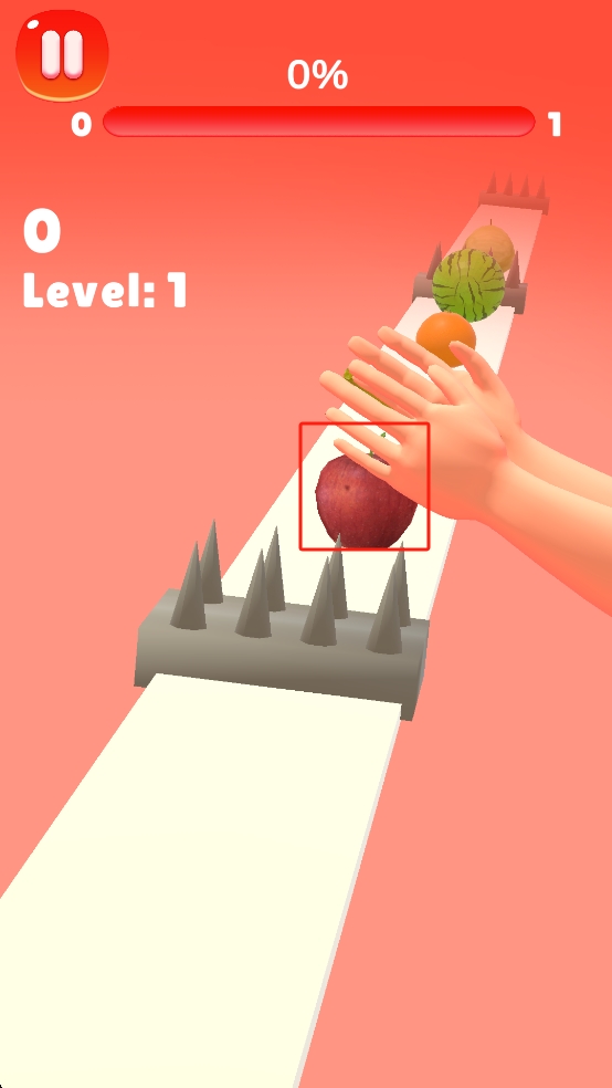 1、Level1里,我们紧盯传送带,在苹果靠近我们前,迅速用手切碎苹果,需要避免手碰到尖刺。