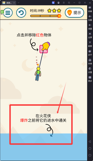2、玩家必须在爆炸前将火柴人扔进水里才能完成关卡挑战,这需要精准的时机把握能力,操作简单直观。
