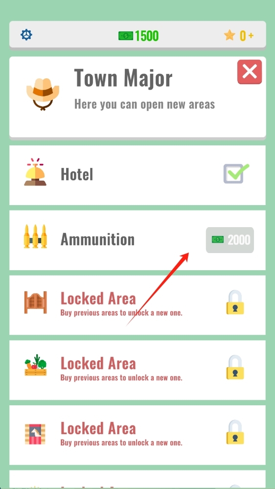 1、打开Idle Wild West,在Town Major界面,攒够金币解锁Ammunition等区域,拓展城镇,点击购买。