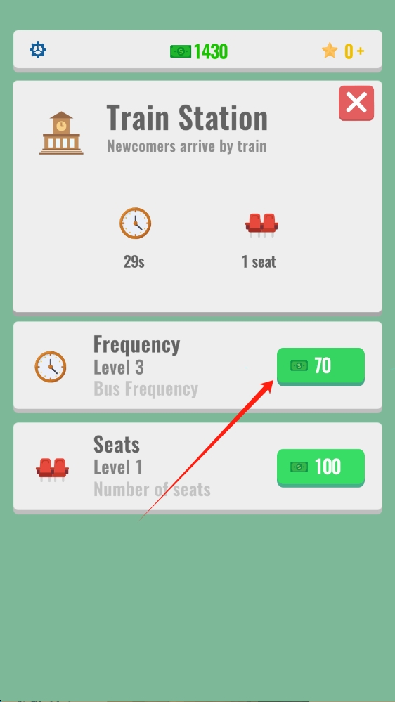 2、进入Train Station,用金币升级Frequency、Seats,提升火车运力,吸引更多新居民,点击升级。