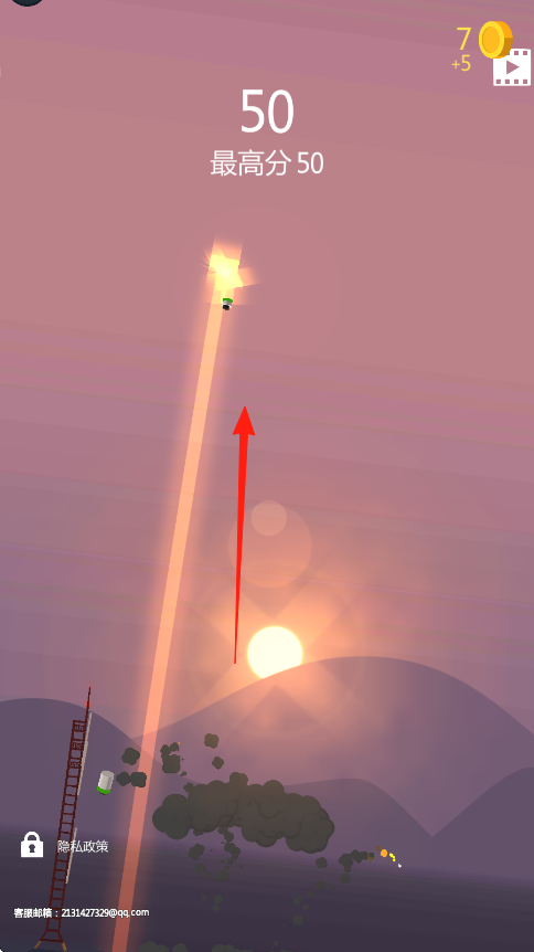 3、火箭持续升空,直至爆炸失控,界面显示最高分50等成绩,收集金币,解锁新火箭、升级功能,重开发射,挑战更高分。