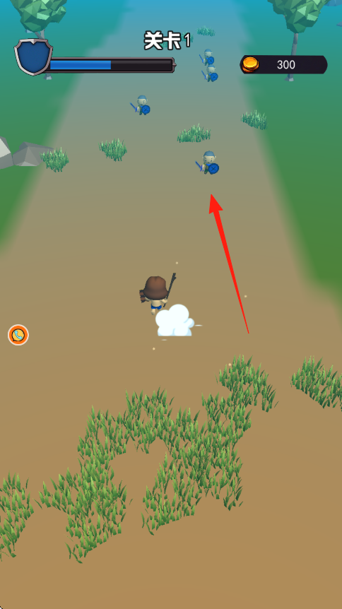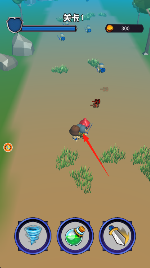 1、操控角色箭头指向,在关卡1场景,沿路径前行,遇蓝色敌人持盾小兵,自动攻击,留意伤害数值-20。