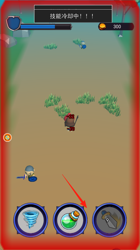 2、下方技能栏龙卷风、绿瓶、剑,战斗中点击对应图标,释放技能如绿瓶回血、剑增伤,应对敌人,注意技能冷却中提示。