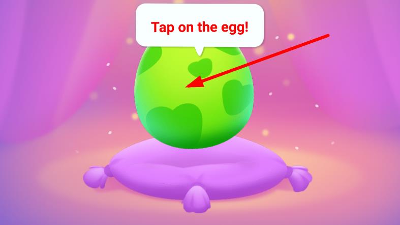 1、进入游戏首界面,聚焦带爱心花纹的绿色蛋,依据“Tap on the egg!”提示,连续点击蛋体,触发孵化动画,见证宠物破壳诞生,开启养宠之旅。