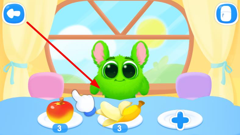 2、切换至餐厅场景,宠物坐在桌前,桌上摆着苹果、香蕉,根据宠物手指指向,点击对应水果投喂,观察宠物进食时的可爱反应,满足其饮食需求。